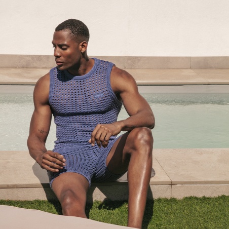 Crochet diamond knit made of finest viscose/cotton. Rib finishing around neck, open armhole and bottom with our embroidered logo on the chest.