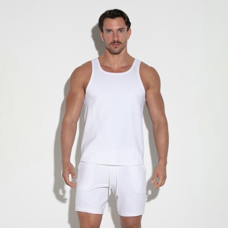 Slim fit tank top made of soft stretch pique fabric. Piping details around the neckline, armhole and a high frequency logo print tab.