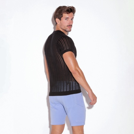 Black knitted polo made of finest viscose/cotton. Rib collar with same finishing around sleeves and bottom with our embroidered logo.