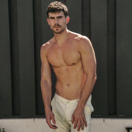 Pantalón regular fit con tejido de microfibra de tacto sedosa. Tiro bajo con cierre cremallera y bajo acabado con puño elástico. Logo icónico 22 grabado a láser en la trabilla.
