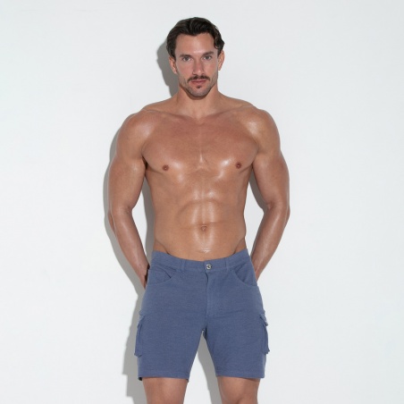Pantalón corto cargo semi ajustado en piqué elástico. Tiro bajo con cierre cremallera, bolsillo plastrón con solapa en ambos lados de la pierna. Logo icónico en parche de polipiel en la cinturilla.