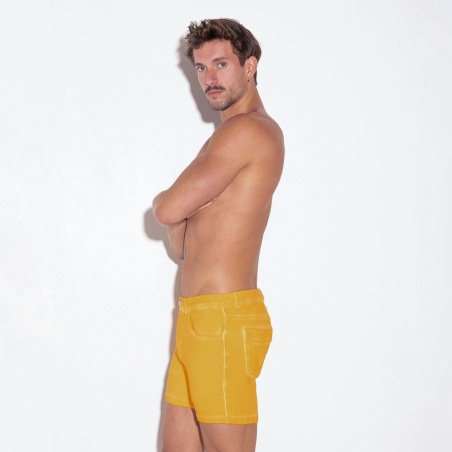 Pantalón corto amarillo semi ajustado fabricado con tecnología elástica. Aspecto desgastado, tiro bajo con cierre cremallera y 5 bolsillos. Logo icónico de silicona en la cinturilla.