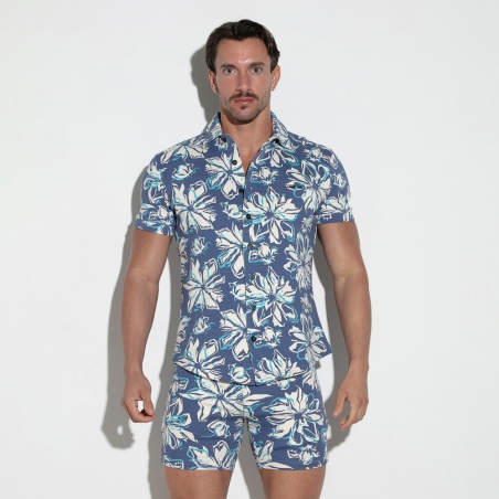 Camiseta semi ajustado con manga corta estampado floral azul marino fabricado con tecnología elástica. Con cuello camisero y cierre frontal de botones y logo icónico de alta frecuencia en el pecho.