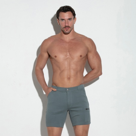 Short cargo gris charbon semi-ajusté fabrique en technologie stretch. Coupe de taille basse avec braguette a fermeture éclair et poche cargo sur le côté. Écusson iconique en silicone à ceinture l'arrière.