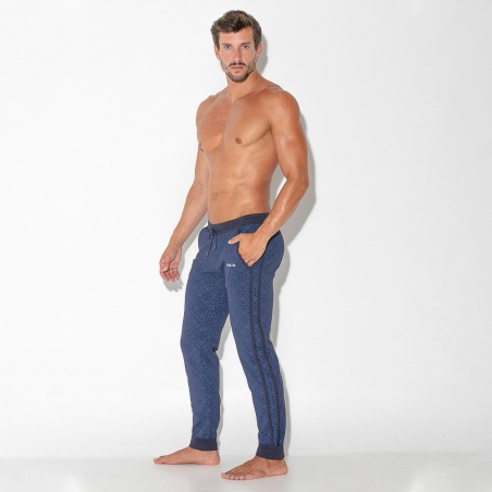 Pantalon jogger imprimé coupe slim en technologie stretch. Détail de deux bande latérale et finitions en côtelée autour de la ceinture et du bas. Logo iconique en haute fréquence sur la cuisse.