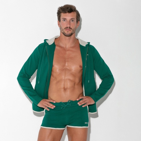 Sweat à capuche semi-ajusté fabrique en technologie stretch. Ouverture zippée devant et poches avec notre logo iconique sur la poitrine. Liseré blanc cassé autour du devant et dos.